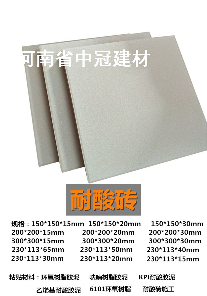 使用說明: 一般環氧樹脂,耐酸膠泥、耐酸水泥鋪貼,鋪貼時可根據上述生產廠家產品使用說明書進行施工; 用草酸清洗混凝土表面,達到酸堿中和; 工業瓷耐酸磚,間縫寬度約8—10mm,間縫深度與磚厚相平為宜,以防泄露; 鋪貼完畢后應用槽酸沖刷表面,以助于更加牢固。