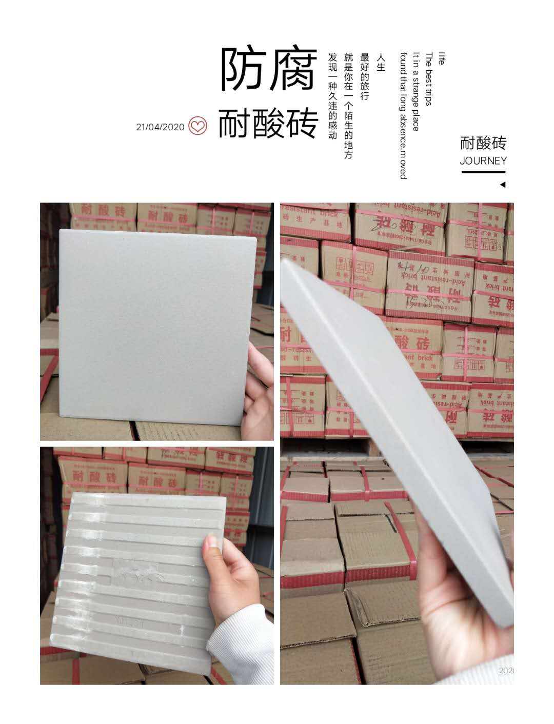 耐酸磚瓷磚是以石英、長石、粘土為主要原料,經高溫氧化分解制成的耐腐蝕材料,耐酸解度高、吸水率低,在常溫下不易氧化,不易被介質污染等性能,除-及熱磷酸外,對溫氯鹽水、-、---等酸類及在常溫下的任何濃度的堿類,具有抗腐作用。耐酸磚防腐 耐酸,防腐行業所需要的建筑材料,耐酸磚產品在防腐行業可使用墻面、地面、塔、池、罐以及露天場地均可使用,耐酸磚使用的環境不同施工時使用的粘接材料也會有很大的區別,通常使用的粘接材料有環氧膠泥、---膠泥等,